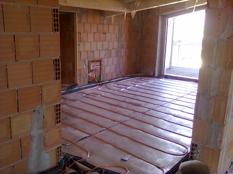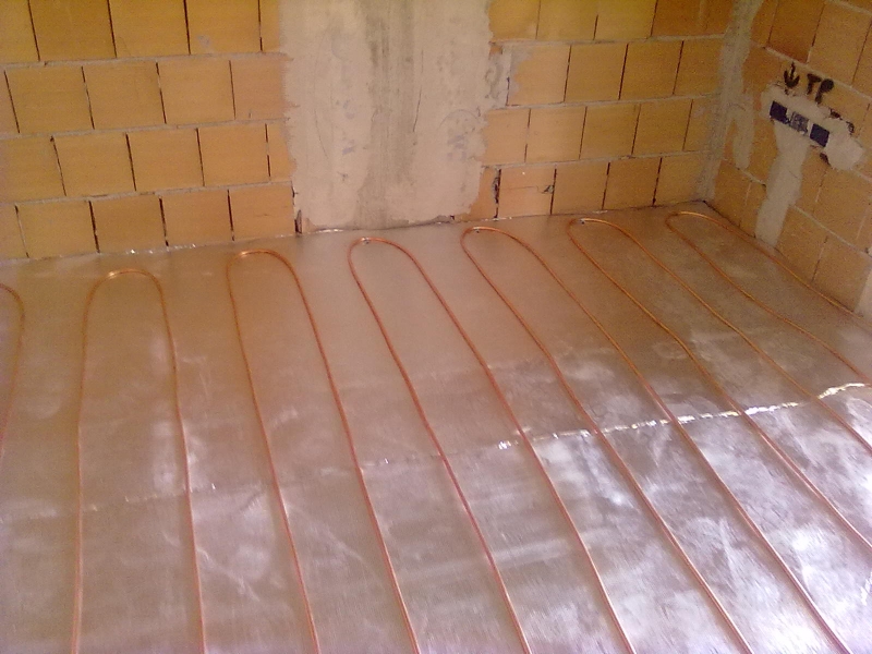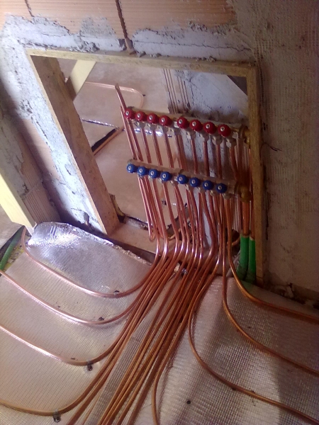 Impianto di riscaldamento a pavimento con serpentina in rame e caldaia a condensazione della dittaRiello;
